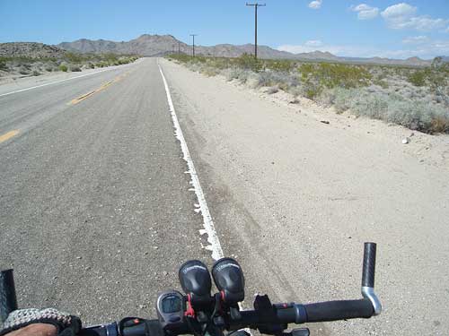 Time evaporates in the heat, and I've just reached the summit of Kelbaker Road at 3800 feet. The powerline road that crosses there begs for my attention, as it often does when I pass here. Though rough, it looks like it's probably ridable in both directions.